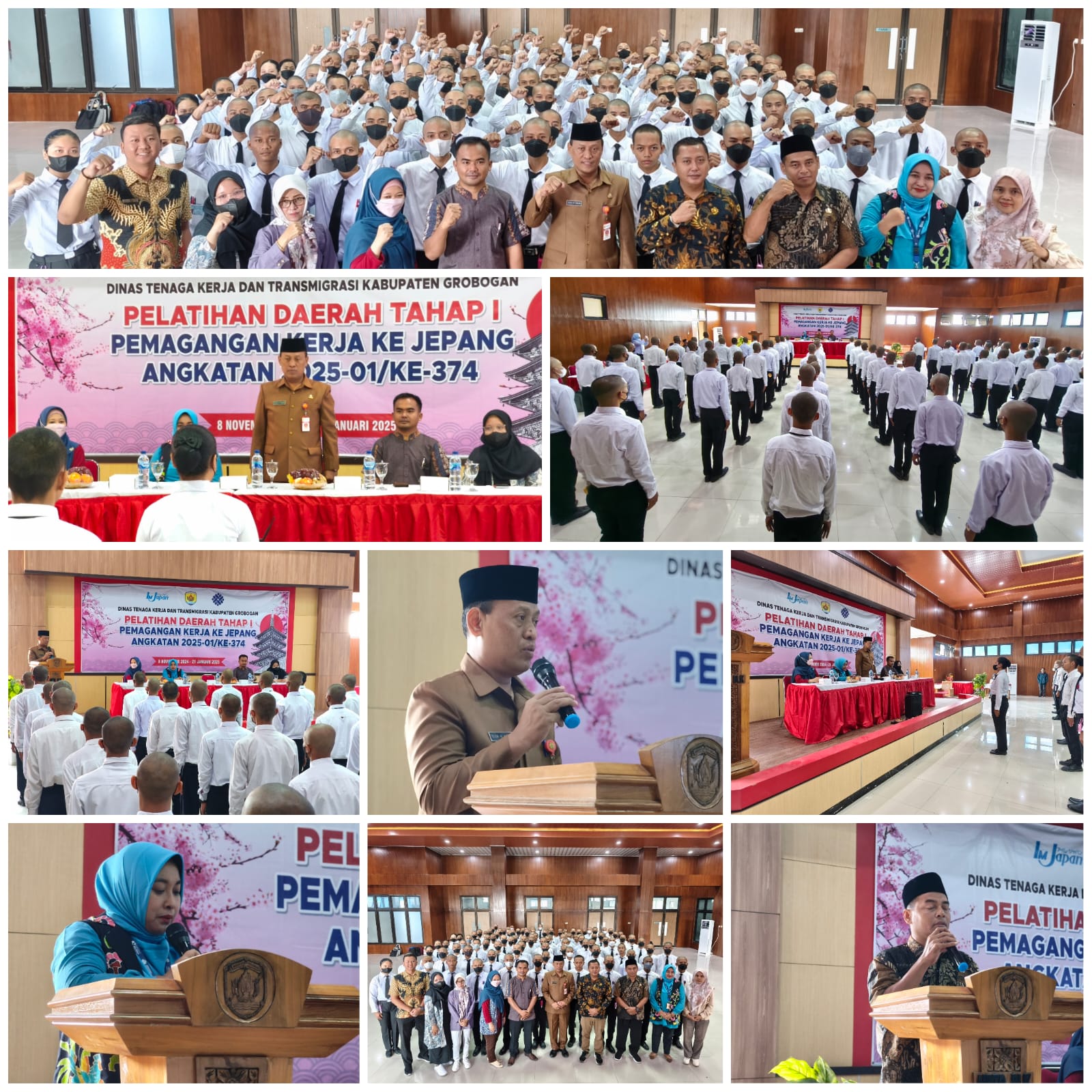 Dinas Tenaga Kerja dan Transmigrasi Kabupaten Grobogan mengadakan kegiatan Pelatihan Daerah Tahap I Pemagangan Kerja ke Jepang Angkatan 2025-01 / Ke-374 yang dibuka oleh Bapak Kepala Dinas Tenaga Kerja dan Transmigrasi, Drs. Teguh Harjokusumo, M.Si di Aula UPTD BLK Kabupaten Grobogan pada hari Jumat tanggal 8 November 2024.