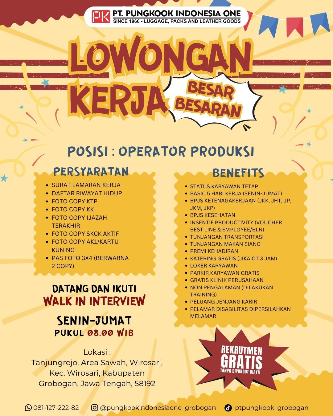 PT Pungkook Indonesia One, perusahaan manufaktur di bidang luggage, tas, dan produk kulit, membuka lowongan kerja besar-besaran untuk posisi Operator Produksi. Kesempatan ini terbuka bagi Anda yang ingin berkarier di industri manufaktur, baik yang sudah berpengalaman maupun fresh graduate.