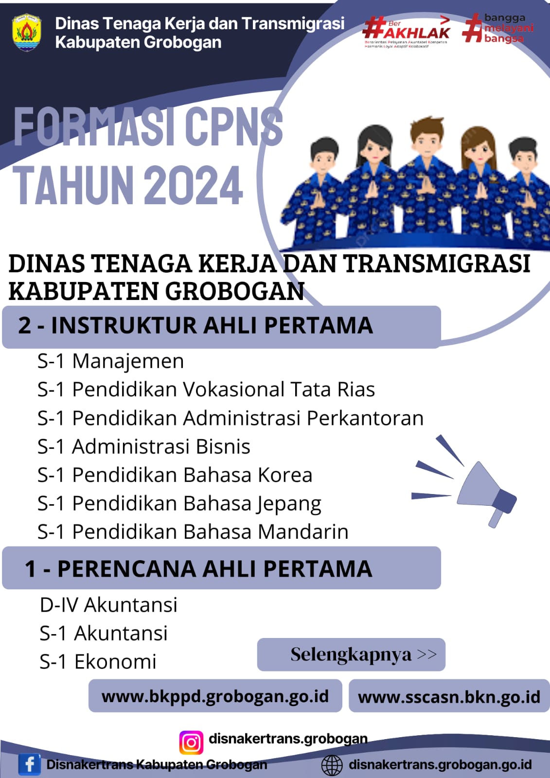 Berdasarkan Keputusan Menteri Pendayagunaan Aparatur Negara dan Reformasi Birokrasi Republik Indonesia Nomor 293 Tahun 2024 tentang Penetapan Kebutuhan Pegawai Negeri Sipil di Lingkungan Instansi Pemerintah Tahun Anggaran 2024, Dinas Tenaga Kerja dan Transmigrasi Kabupaten Grobogan memanggil Putra dan Putri terbaik bangsa untuk mengikuti seleksi CPNS Tahun 2024