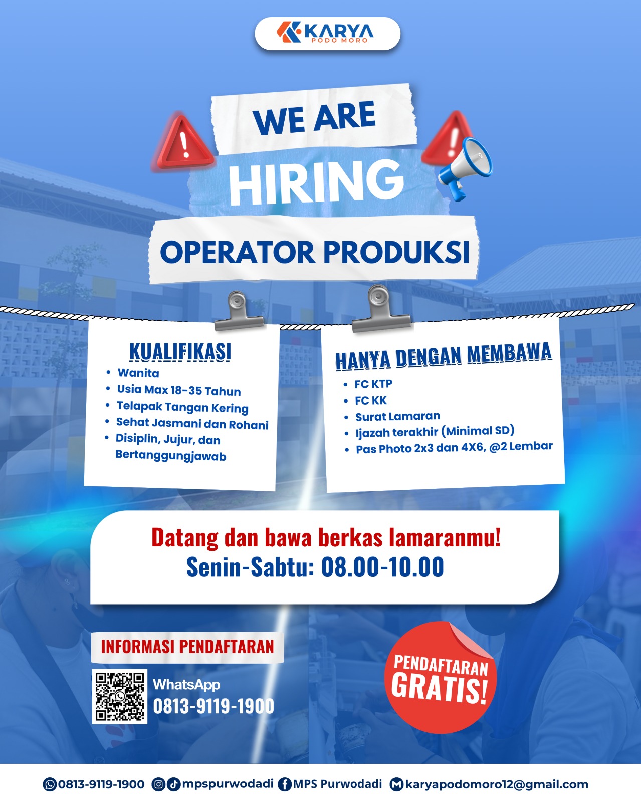 Yang membutuhkan pekerjaan bisa langsung datang dan membawa berkas lamaran.