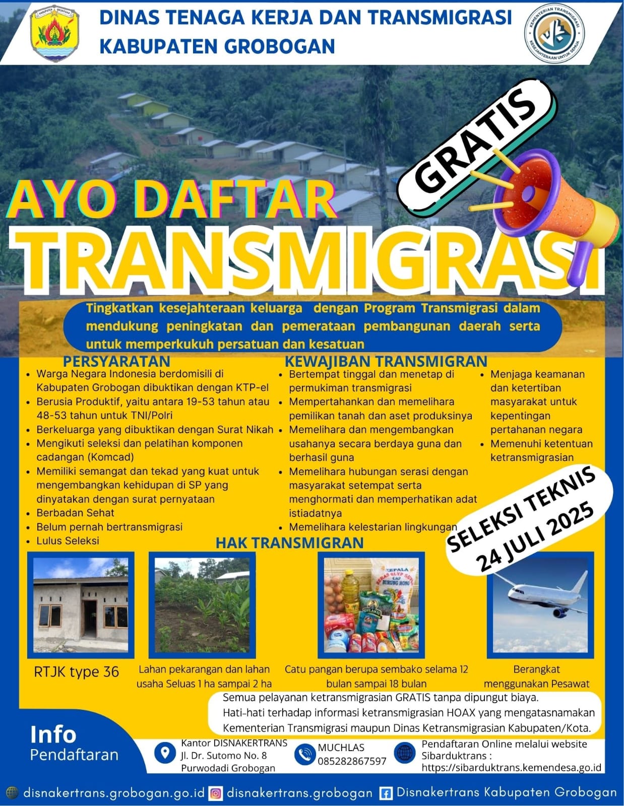 Dinas Tenaga Kerja dan Transmigrasi Kabupaten Grobogan membuka pendaftaran calon transmigrasi Tahun Anggaran 2025.